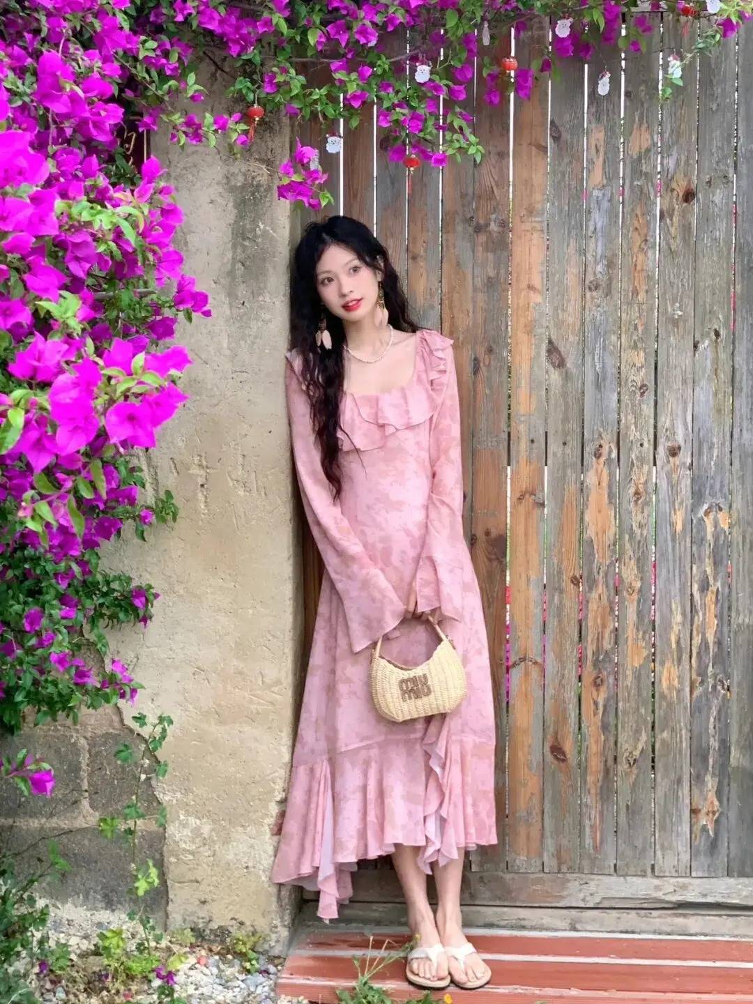 人物在花篱木门前,自然倚立,姿态优雅又有复古感。这种姿势巧妙融合了繁花与旧木的浪漫氛围,粉色长裙与草编包在花景中格外柔美,既凸显出人物的温婉气质,又借复古场景烘托出文艺感,轻松拍出充满格调的打卡大片,这波花篱拍照的巧思绝了~