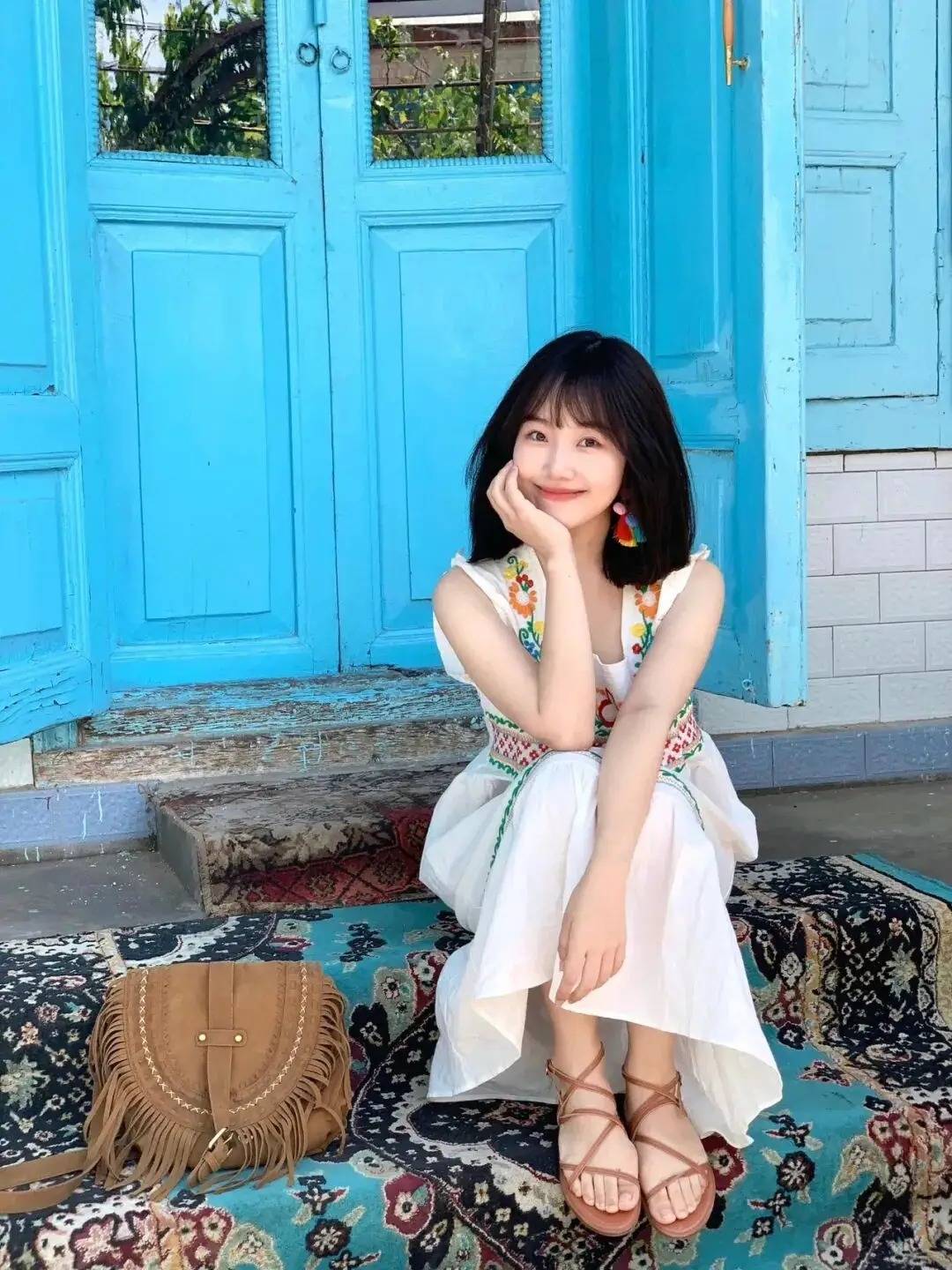 人物在蓝门彩毯前,优雅落座,一手托腮,姿态温柔又有氛围感。这种姿势巧妙融合了异域风场景的独特韵味,刺绣裙与彩色配饰在蓝白背景中格外吸睛,既凸显出人物的恬静气质,又借复古门廊烘托出文艺感,轻松拍出充满格调的打卡大片,这波异域风拍照的巧思绝了~