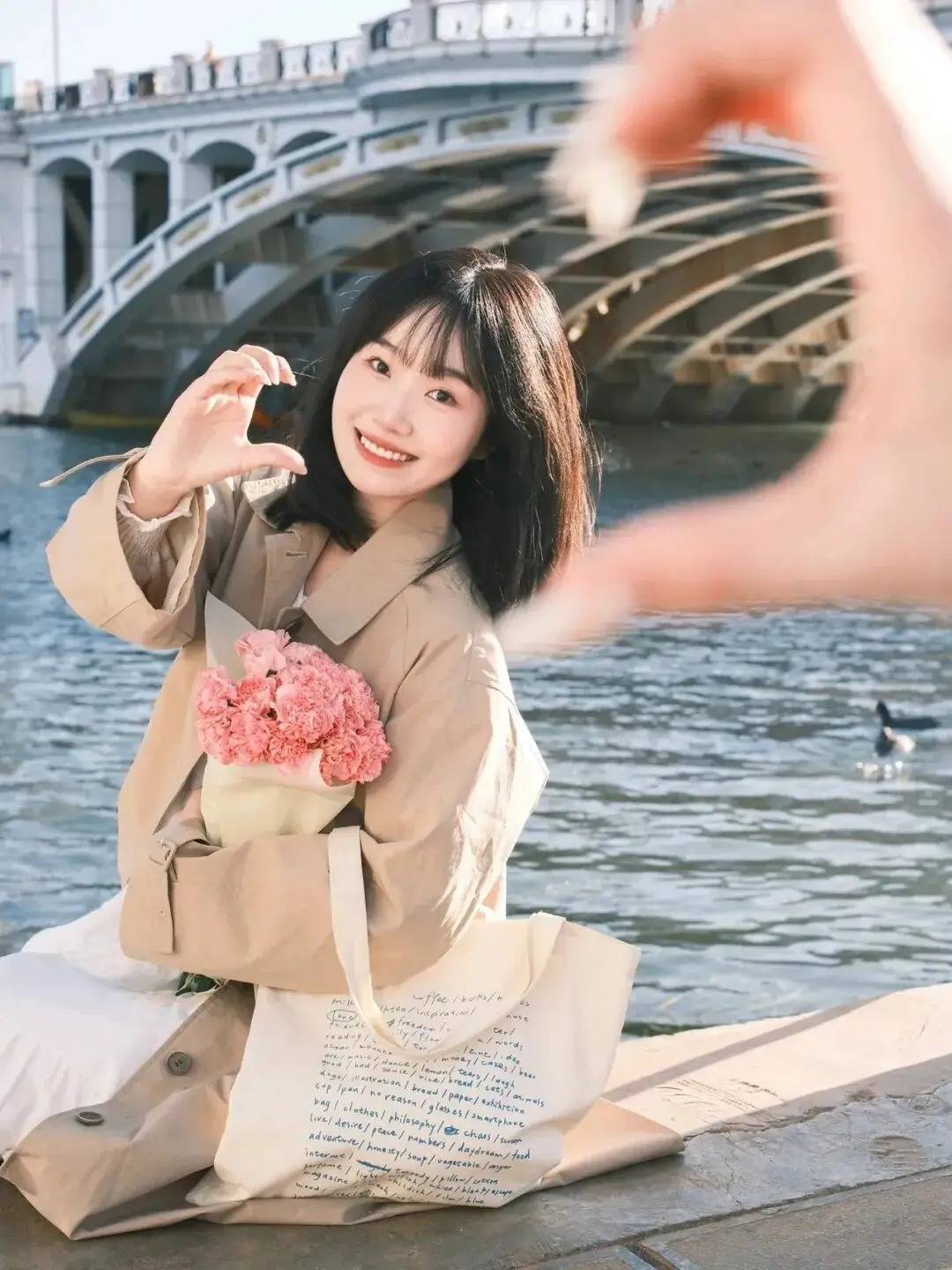 人物在河畔桥边,手持花束,一手比心,姿态甜美又有互动感。这种姿势巧妙结合了水景桥景的浪漫氛围,花束与文艺包袋增添了画面细节,既凸显出人物的温柔气质,又借手部动作拉近了与观者的距离,轻松拍出充满爱意的打卡大片,这波河畔拍照的巧思绝了~