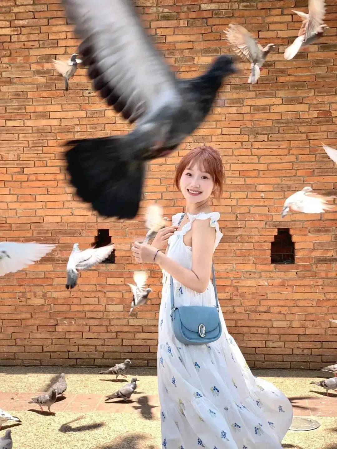 人物在鸽群红砖前,自然站立,姿态松弛又有画面动感。这种姿势巧妙借飞鸽营造出灵动氛围,碎花裙与蓝包在红墙前格外清新,既凸显出人物的温柔气质,又让鸽群成为天然的动态布景,轻松拍出充满生机的打卡大片,这波喂鸽拍照的巧思绝了~