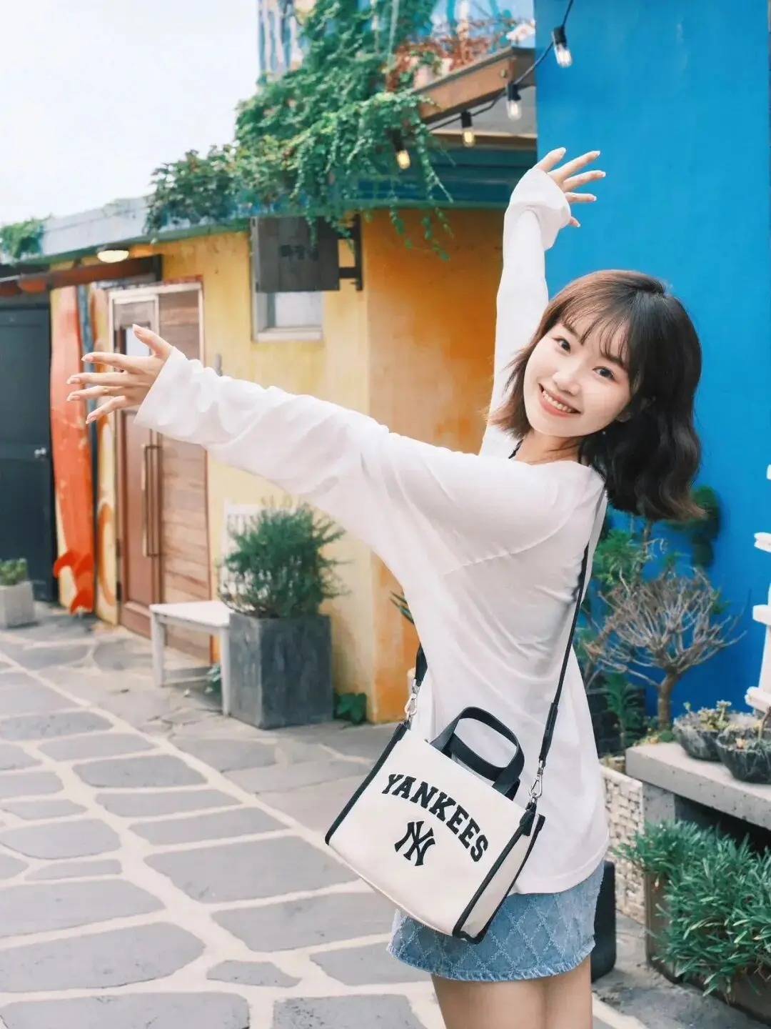 人物在复古瓷艺墙前,一臂扬起挥手,一臂自然伸展,姿态活泼又有互动感。这种姿势巧妙呼应了复古场景的文艺氛围,浅蓝穿搭与斑驳瓷墙形成视觉呼应,既凸显出人物的元气,又借特色背景烘托出故事感,轻松拍出充满格调的打卡大片,这波复古场景拍照的巧思绝了~