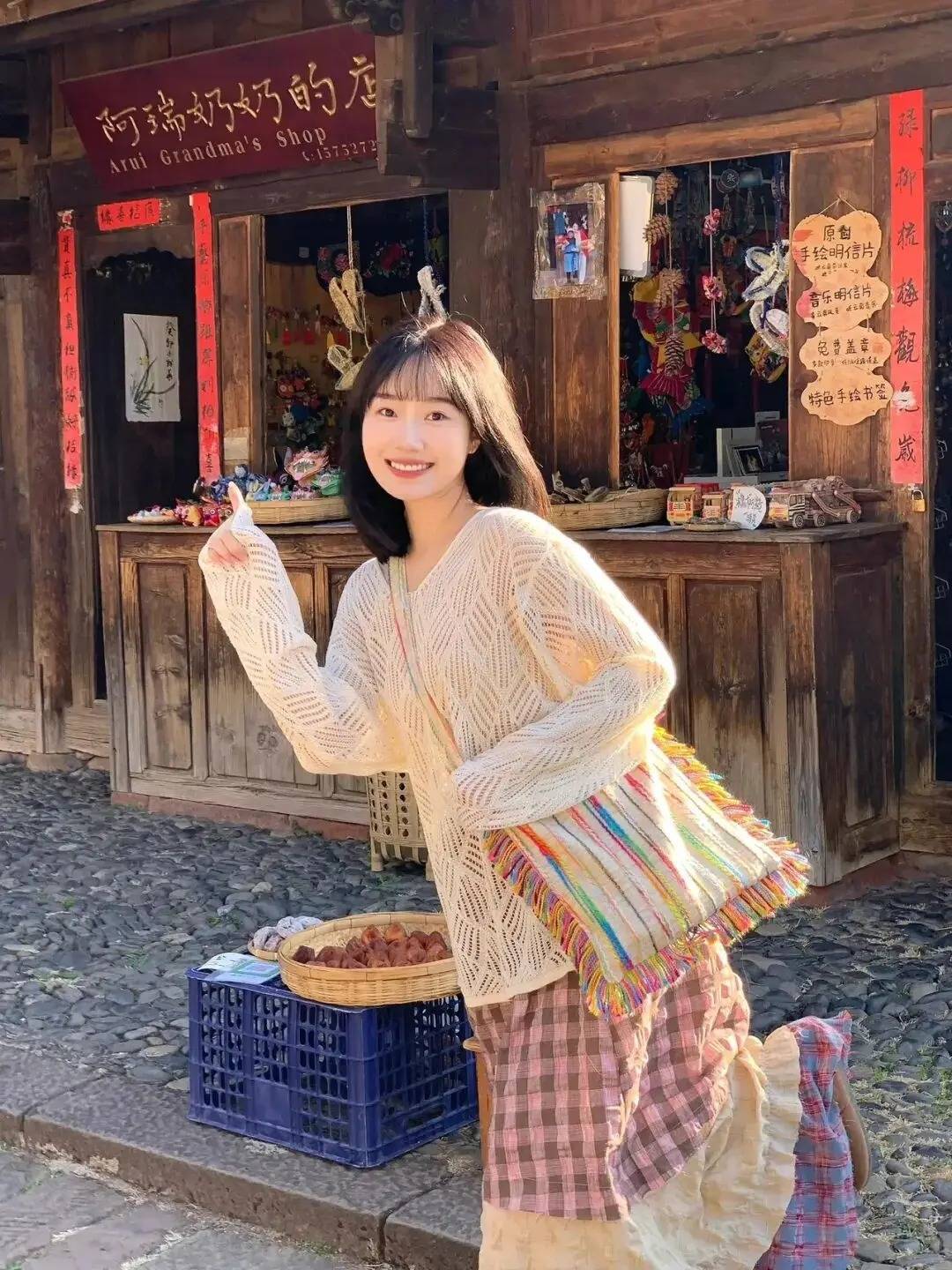 人物在复古小店前,一手竖起拇指,姿态活泼又有亲和力。这种姿势巧妙融入了古色古香的市集场景,多彩穿搭与木质店铺形成复古呼应,既凸显出人物的元气感,又借特色小店烘托出烟火气,轻松拍出充满故事感的打卡大片,这波复古市集拍照的巧思绝了~